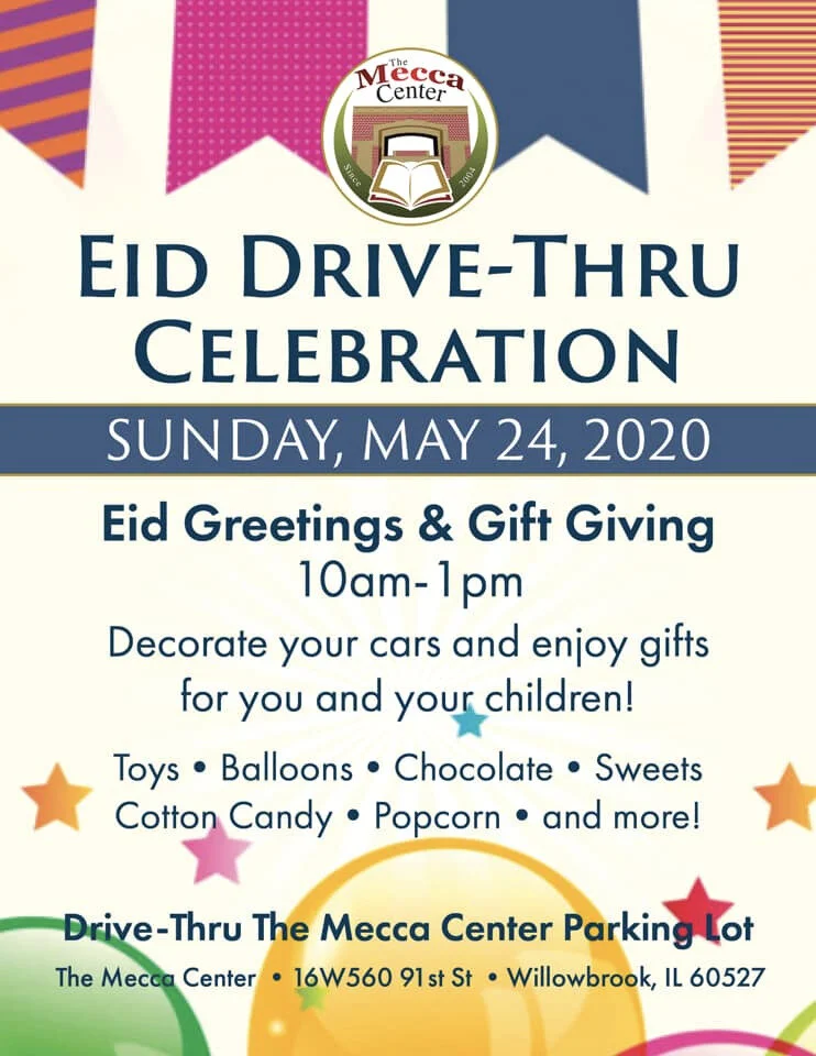 Come to the Mecca Center parking lot for Eid greetings and gift giving on Sunday, May 24th from 10am to 1pm