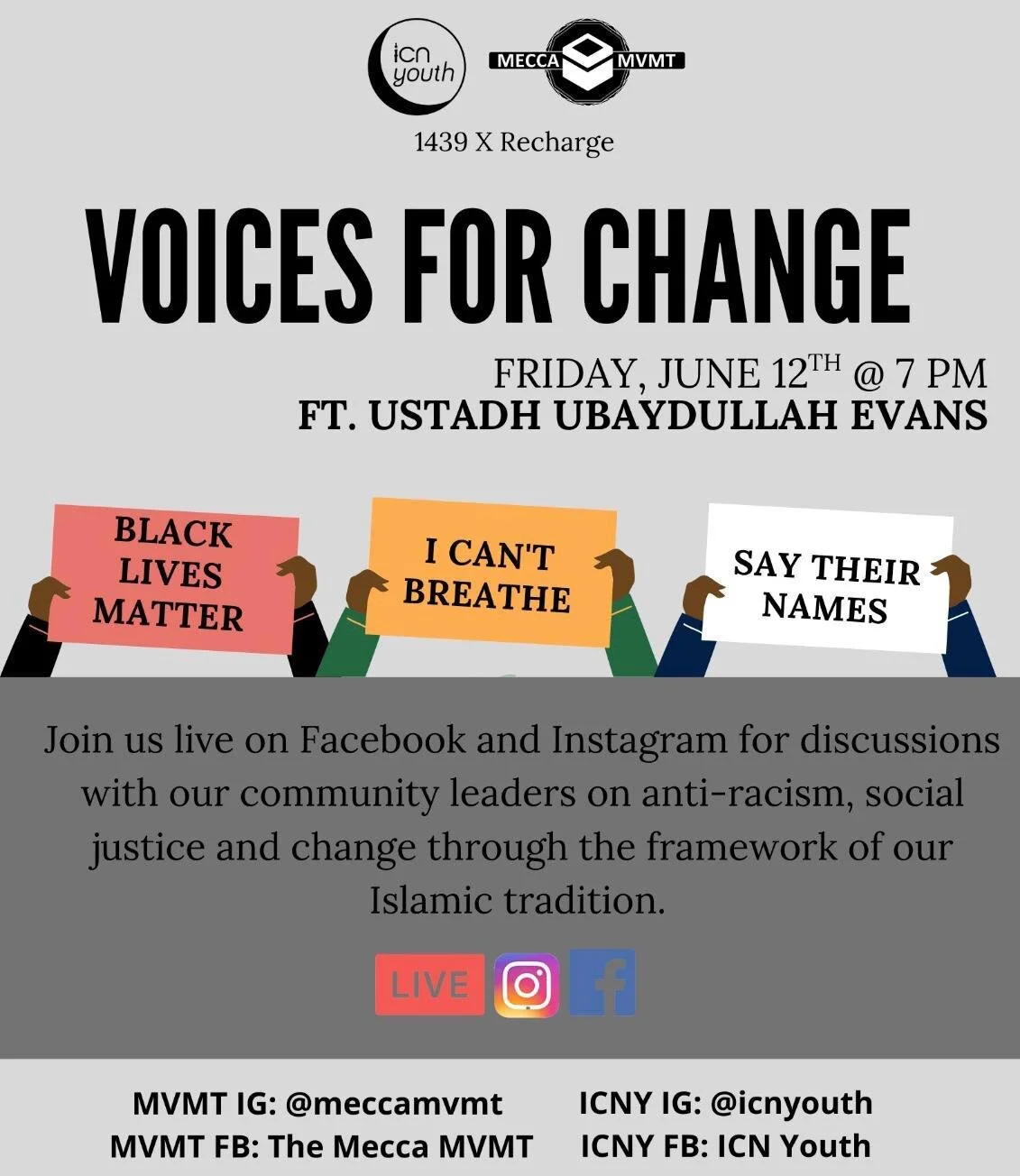 1439 x Recharge present Voices for Change ft. Ustadh Ubyadullah Evans Friday, June 12, 2020 7:00 PM 8:00 PM Google Calendar ICS Join ICN Youth’s 1439 and Mecca MVMT’s Recharge on Instagram or Facebook live for a special discussion on 'Voices for Change' featuring special guest speaker Ustadh Ubaydullah EvansJoin via Facebook or Instagram