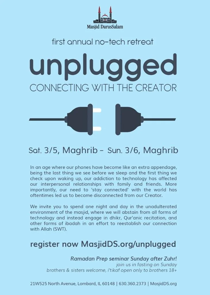 Back to All Events Masjid DarusSalam - No-Tech Retreat: Unplugged Saturday, March 5, 2022 10:00 AM Sunday, March 6, 2022 11:00 AM Google Calendar ICS