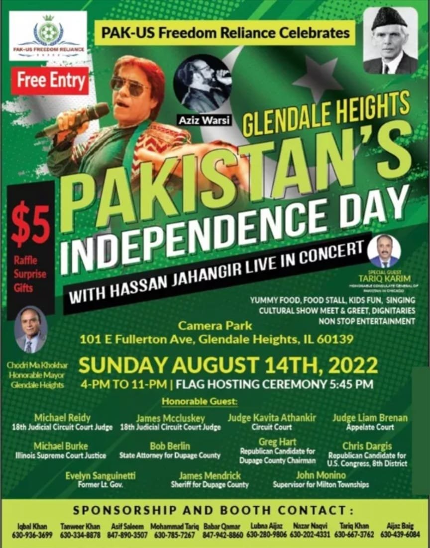 Glendale Heights Pakistan's Independence Day Sunday, August 14, 2022 4:00 PM 11:00 PM Google Calendar ICS