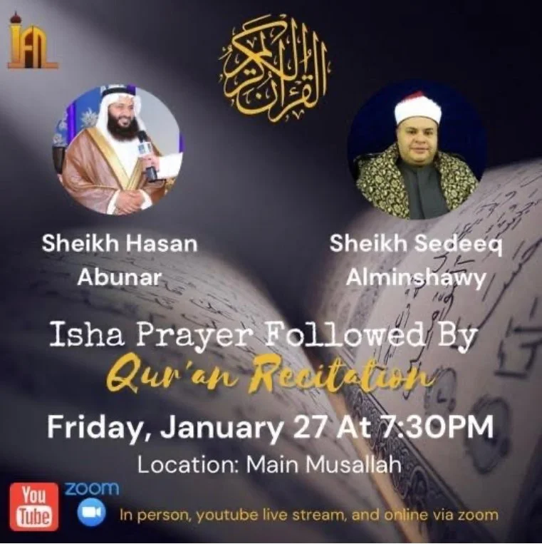 IFN: Isha Prayer Followed by Quran Recitation Friday, January 27, 2023 7:30 PM 8:30 PM Google Calendar ICS