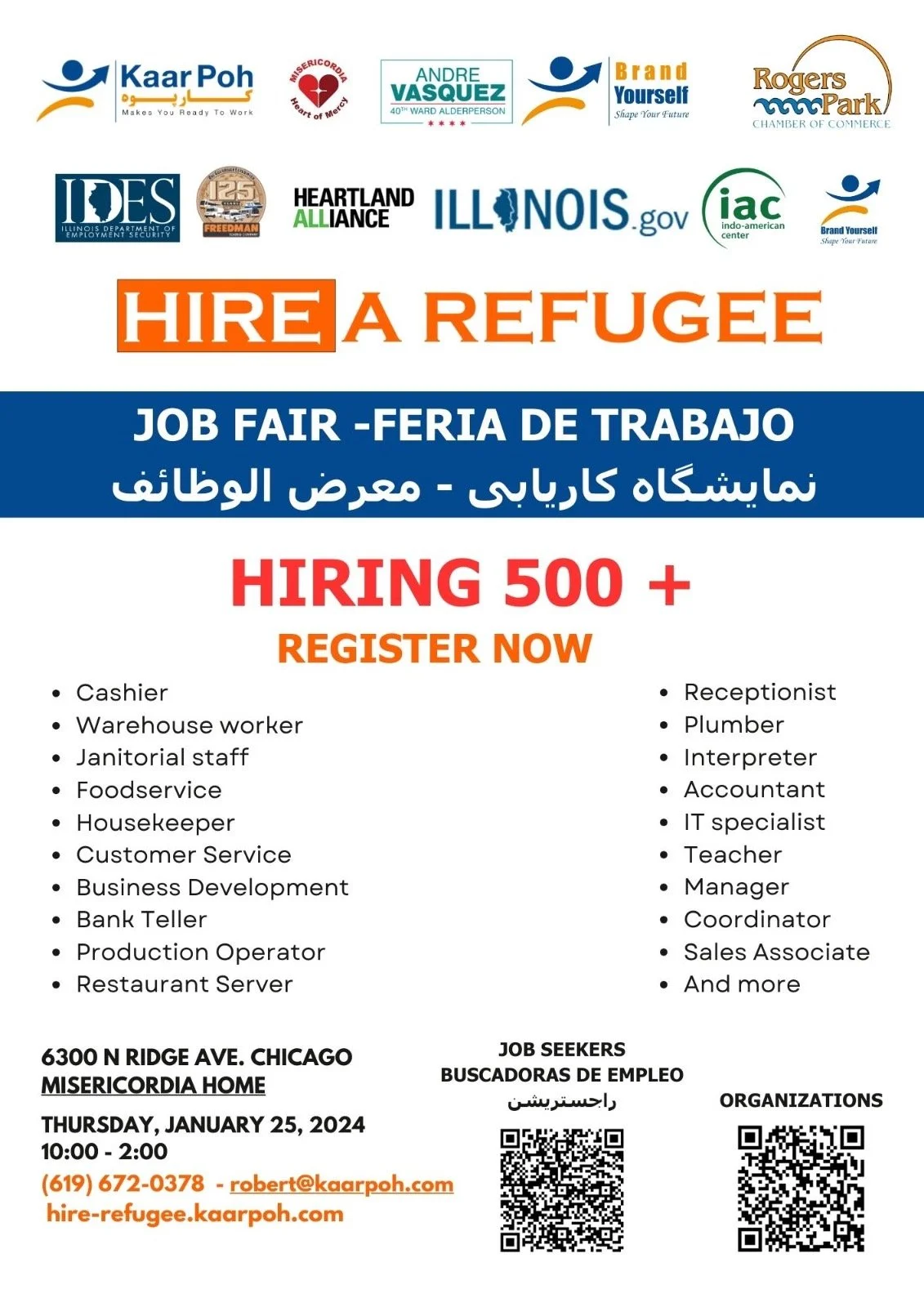 Hire a Refugee Thursday, January 25, 2024 10:00 AM 2:00 PM Misericordia Home 6300 North Ridge Avenue Chicago, IL, 60660 United States (map) Google Calendar ICS