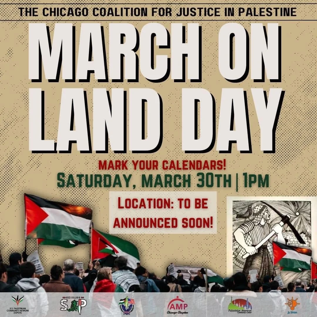 The Chicago Coalition for Justice in Palestine - March on Land Day Saturday, March 30, 2024 1:00 PM 3:00 PM Google Calendar ICS