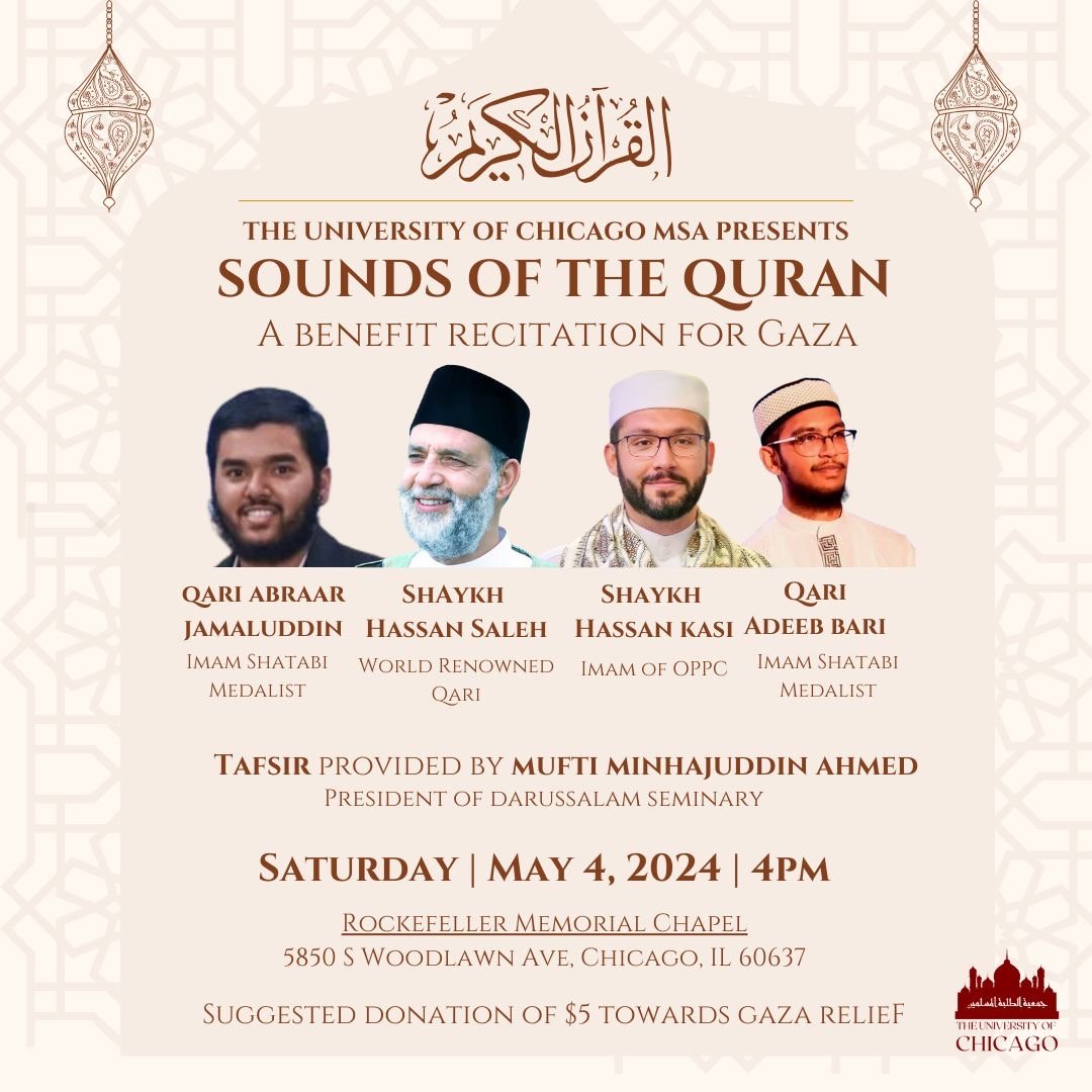 University of Chicago MSA Presents Sounds of the Quran Saturday, May 4, 2024 4:00 PM 5:00 PM Google Calendar ICS