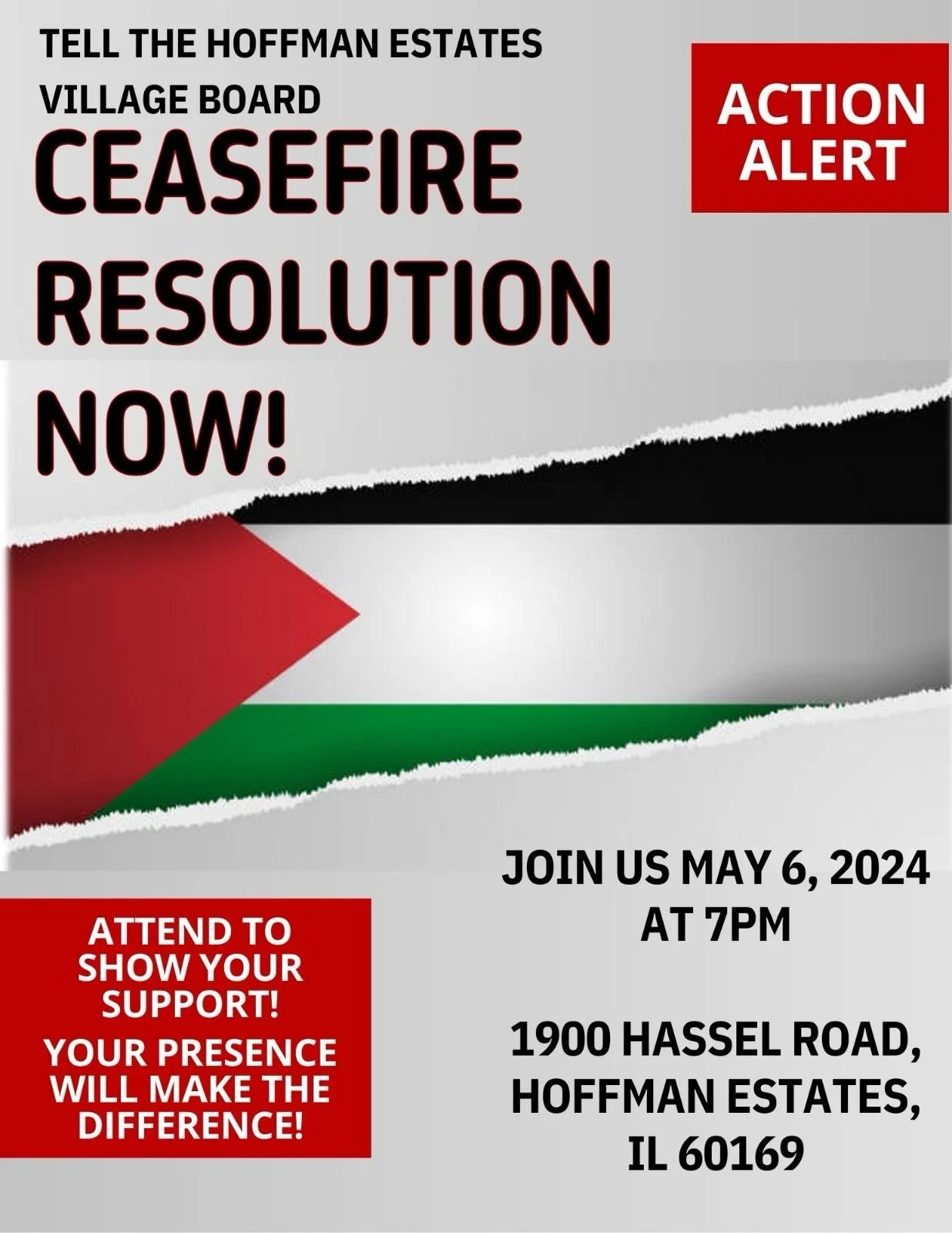 Hoffman Estates Village Board: Ceasefire Resolution Now Monday, May 6, 2024 7:00 PM 8:30 PM Google Calendar ICS
