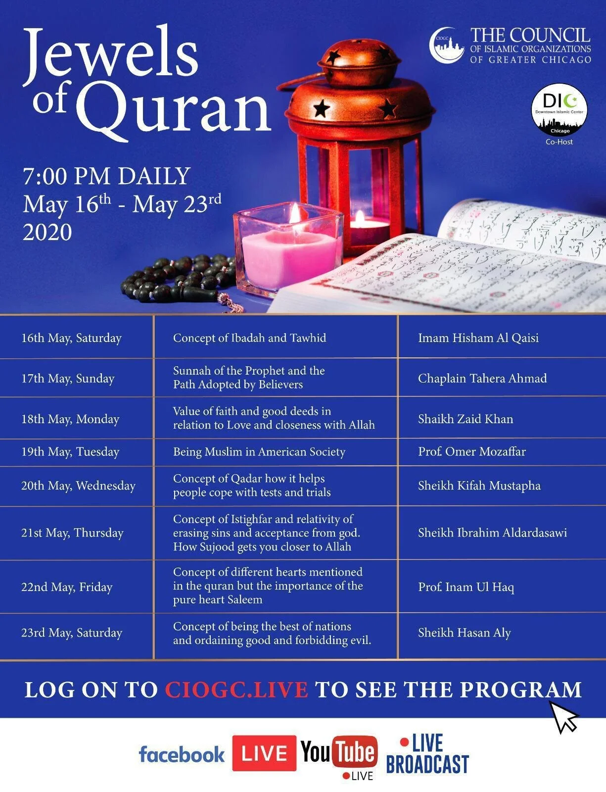 Join CIOGC and DIC daily from May 16th to May 23rd. A different topic and speaker every night including Sh. Kifah Mustafa and Prof. Inam up Haq