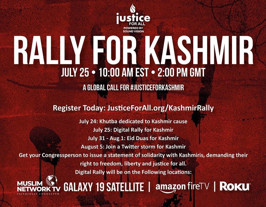 Justice for All Rally for Kashmir Saturday, July 25, 2020 9:00 AM 11:00 AM Google Calendar ICS Join Justice for All’s Global Rally for KashmirSaturday July 25th at 9:00am CDTJoin online